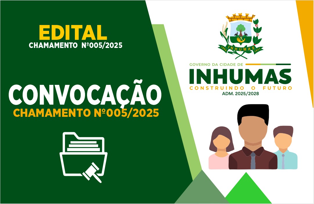 O Prefeito Municipal de Inhumas, JOSÉ ESSADO NETO, por meio da Secretaria Municipal de Gestão, no uso de suas atribuições legais, e considerando a homologação do resultado do Concurso. CONCURSO PÚBLICO DO MUNICÍPIO DE INHUMAS, ESTADO DE GOIÁS EDITAL Nº 001/2023 CONVOCAÇÃO 005.2025